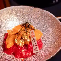 Sea urchin plus raw beef, decorated with gold foil and shredded seaweed.