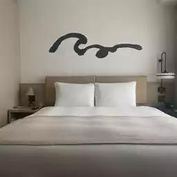 The room was very stylish with Scandinavian-style furniture, a glass-walled shower room, and impressive ink art!