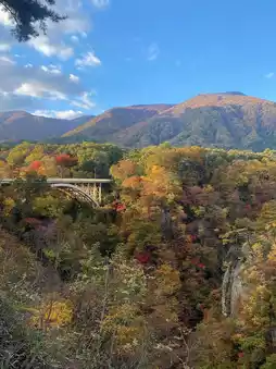 Naruko Gorge, located in Osaki City, Miyagi Prefecture, is a renowned spot that attracts autumn foliage enthusiasts from all over Japan. The vibrant autumn colors spread across the deep V-shaped gorge create a picturesque scene that resembles a painting. Especially from mid-October to early November, the gorge is adorned with shades of red, yellow, and orange, creating a stunning contrast with the Otani River flowing through it.