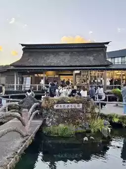 There are shops in the village selling snacks and souvenirs. Many souvenirs are printed with Mount Fuji images. For snacks, you can try the grass cake with mugwort. Mugwort is a herb native to the growing area around Oshino Hakkai. The Kusamochi is stuffed with red bean paste, and the overall texture is similar to red bean mochi.