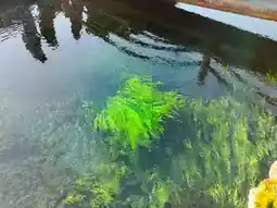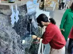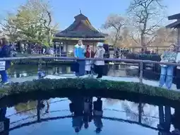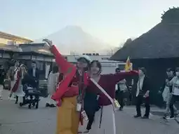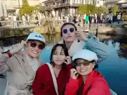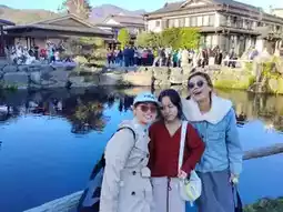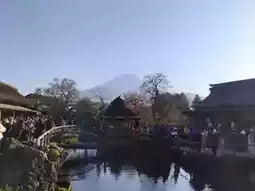 Auntie Aom complained... Oshino Hakkai Village, a clear water village. After taking bus number 6 for almost an hour, the bus was full of passengers, and we had to stand the entire way. I was so tired. But when I arrived at Oshino Hakkai Village, my tiredness lessened because the atmosphere was so wonderful. Even though it was past 4 PM, there were still tourists, but it wasn't crowded. I was able to take photos from every angle I wanted. The pond was crystal clear and deep, allowing me to see fish swimming around. The trees in the pond were lush and green, swaying. There was a distant view of Mt. Fuji behind me. The sky was crystal clear and bright. The souvenir shop was also popular. There were side dishes to try and eat with rice. They were delicious. However, we were short on time, as the last bus was at 6 PM. We rushed out to wait for the bus, so we didn't get to visit other spots. There was a park behind us and cherry trees, although they had already withered. But we ended up waiting for the bus for a very long time. The bus was full of passengers until the end, and we had to stand the entire way, haha. I plan to come early next time or rent a car. It'll help you manage your time and get to many more places.