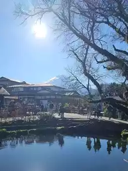The changing seasons dramatically alter the scenery: cherry blossoms in spring, lush greens in summer, golden rice paddies in autumn, and snow-dusted roofs in winter. The air is fresh and crisp, carrying faint scents of water, earth, and vegetation. From every corner, Mount Fuji majestically presides over the village, its reflection in the ponds offering a perfect balance of tranquility and grandeur.