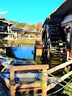 The village paths wind gently among rustic thatched-roof houses, and the subtle trickle of water from the ponds adds a meditative soundtrack to the stroll. Fallen leaves float gracefully along the water, while the reflections of nearby mountains add depth and contrast, making every scene a natural masterpiece. Small shrines and wooden markers along the walkways lend cultural context, enhancing the charm of the village’s autumn scenery.