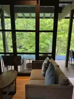 The lounge offers unlimited drinks and snacks. Private hot springs and the heated pool are free to use, while the sauna is available for an additional fee.
