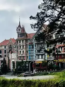 The hotel's red roof stands out against the blue sky, giving it a truly exotic feel.