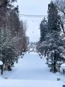 [Hokkaido] A shrine with a beautiful contrast between the ginkgo trees and snow