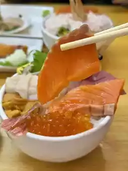 A luxurious seafood bowl topped with plenty of salmon roe, sea urchin, salmon, bluefin tuna, button shrimp, scallops, and clams!