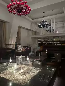 The red and black glass chandeliers in the high-ceilinged modern space were lovely🕊️
