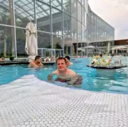 The location of Therme Bucharest (Therme București) was determined by the geothermal water, which is extracted from a depth of more than 3100m. It then passes through a complex process of decalcification, desulphation, decarbonization and, ozonation before reaching the pools. The geothermal water is extracted at a temperature of over 80°C/176°F and is used primary as a heating agent for the relaxation areas. After passing through a 5 steps treatment system, it is used in the swimming pools, where the temperature is of about 33°C/91°F.