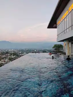 The infinity design invites you to lean into the horizon, where hills ripple in the distance and the city hums gently below. It’s a space of quiet grandeur—where even a casual dip becomes a moment of reflection. Families gather near the kids’ pool, laughter echoing against the glass walls, while solo travelers find peace in the stillness.
