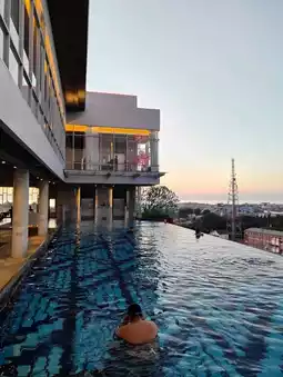 It wasn’t just a swim. It was a slow dance with the night. The pool lights pulsed gently beneath me, like bioluminescent jellyfish, while the breeze whispered stories from the Minangkabau highlands. I swam a few lazy laps, then paused at the edge—elbows resting on cool tiles, heart resting in the hush.
