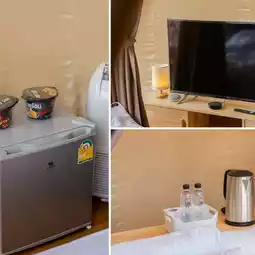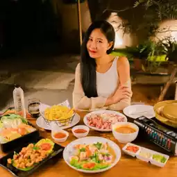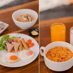 🍱 For breakfast, there are sets to choose from, such as ABF, rice porridge, fried eggs, served with milk, bread, and fruit. For dinner, I ordered a pork pan. The sauce was amazing. There was also a cooked shrimp salad, fried chicken tendons, and French fries. Eat it with a cold drink and a great atmosphere. So awesome!