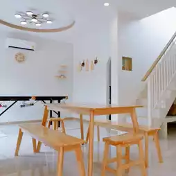 A new house to stay in And it looks minimalist. Upstairs there are 3 bedrooms, 2 bathrooms (the master bedroom has a bathtub too). Downstairs there is 1 room, 2 bathrooms. The house is in a good location, private, like a vacation home, not far from the entrance to Khao Yai National Park and near tourist attractions.