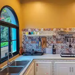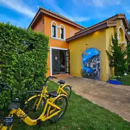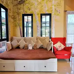 The accommodation is decorated with 3D art paintings on the walls, has a private pool, barbecue, karaoke, comes with a mountain view and a green garden behind the house that is ready for us to come and take pictures.
