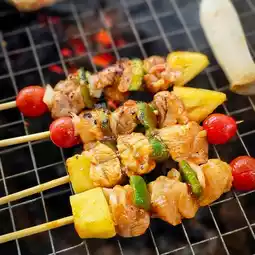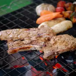 There's a barbecue grill with charcoal, an ice bucket with ice, and food and beverages available for purchase. You don't need to leave the house to party with friends and family.
