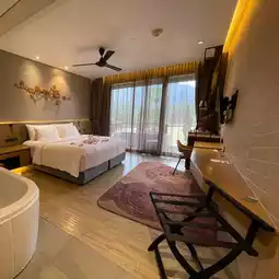 Dusit D2 Khao Yai Hotel, an accommodation surrounded by green mountains, modern design. The highlight here is the swimming pool facing the mountains. There is a Sunken Seat for sipping drinks and eating delicious food. Let's come to the room. Every room here is sexy because there is a bathtub in the bedroom. There is a free mini bar and complete facilities.