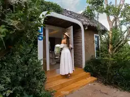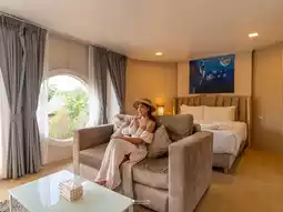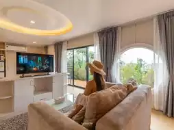 🛖 There are many types of rooms to choose from. The room we stayed in was a jacuzzi room. The outside of the room didn't look big. But when you enter, the room is very big. There is a 6-foot bed, a sofa, a kitchen area with a refrigerator, a microwave, a coffee maker, an electric stove, a kettle, a sink, a large bathroom, and a very cold air conditioner. When you open the door, there is a Jacuzzi bathtub, a panoramic view.