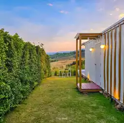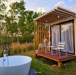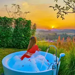 Villa-style container-style rooms with private lawns and a bathtub in front of the room overlooking the lawn, mountain views and flower fields. The room is cute with an en suite bathroom with a water heater and complete amenities in the room.