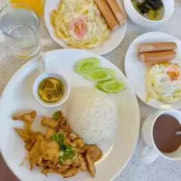 There are options such as rice soup, garlic pork rice, basil rice, and a drink bar🥛☕️🍵, toast🍞🥖, and fruit🍎🍌🍊🥝 to serve yourself.