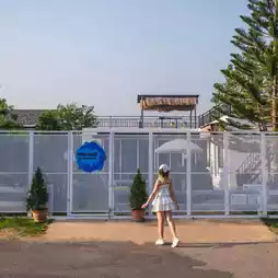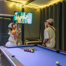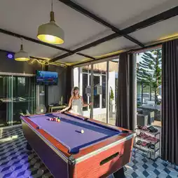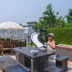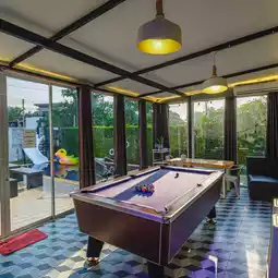 a swimming pool, water slide, karaoke 🎶, a pool table, a fully equipped kitchen, and a barbecue grill.