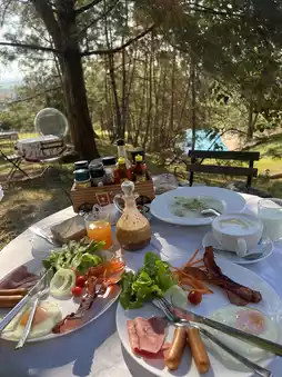 🍳 As for breakfast, you can tell the staff what you want to eat, set the table outside or inside. When we went, there was porridge, bread, orange juice, fresh milk, bacon, sausage, fried eggs, fruits and desserts. The staff prepared to set the table beautifully and took pictures for us as usual. Very impressed