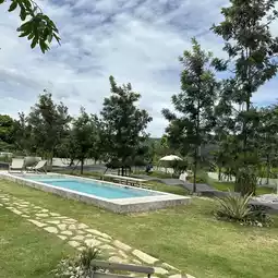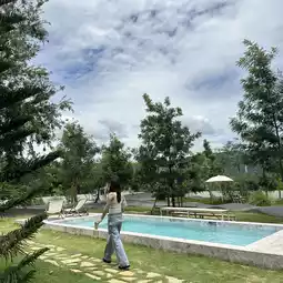 At the back of the shop, there is a cool photo corner. It is a white clothesline with lace fabric. It gives off a young lady feel that the mother uses to hang clothes. 555 There is also a beautiful swimming pool corner for taking pictures. Anyone who likes cafes and has a chance to visit Khao Yai must stop by to check in. It is considered another landmark with many beautiful photo corners.