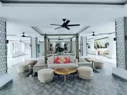 🏘️In the hotel area, there is a large swimming pool, a cafe, a signature restaurant, a clear dome, a kids club, and a lawn area to sit and relax. The lobby is airy and there are a lot of seats.