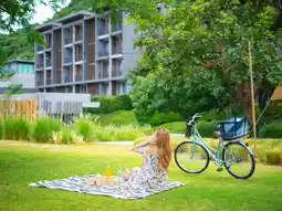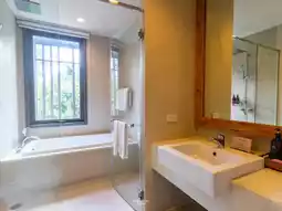 There are many types of rooms here. We stayed in the Deluxe Room Mountain View, a room with a mountain view. The hotel area is also spacious. There are many activities to do, including a swimming pool, fitness center, cycling, and picnics. There is also a local restaurant serving fusion Isan food to add more deliciousness.