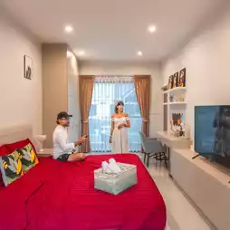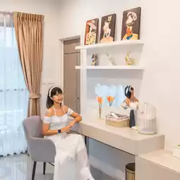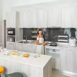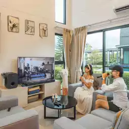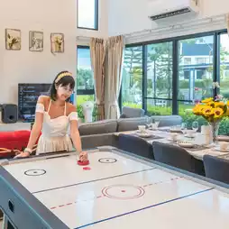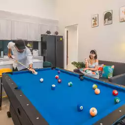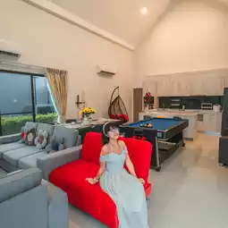 My uncle and I like that the kitchen is fully equipped. There is a bar counter with a luxurious dining table for use. If you come out to play in the pool, it is wide and looks good. If you want to chill out camping, there is a barbecue stove for you to use.