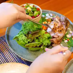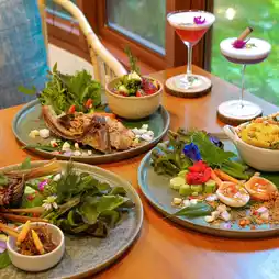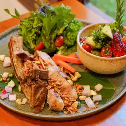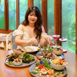 🥚🌱 The Egg Bar & Restaurant, a new restaurant and bar in Khao Yai, is hidden in the La Cocotte Villa & Farm Khao Yai hotel. The shop is beautifully designed, with a shady atmosphere. There is a waterfall and a fish pond to add freshness to the shop. The interior is beautifully decorated, giving a warm feeling. There are leaves and flowers as decorations, making it look even more beautiful. The food is in the Isan fusion style. The food tastes delicious and spicy. The ingredients are of high quality. They use fresh vegetables from the farm that the shop grows itself. Each menu is carefully created to create a perfect balance of flavors.