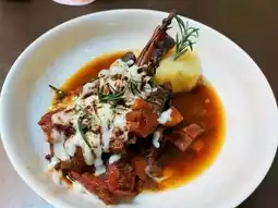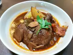 Stewed lamb shank in red wine. The lamb is quite tender but not too soft. The taste is quite good.