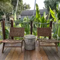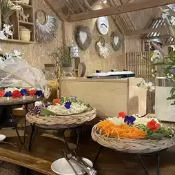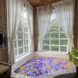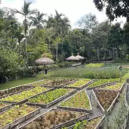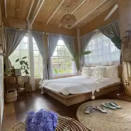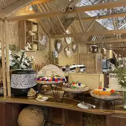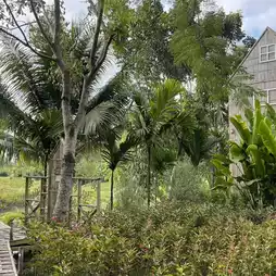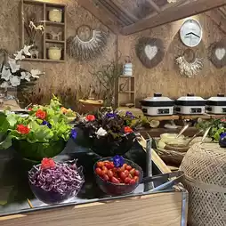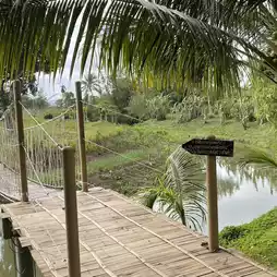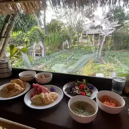 Accommodation in Khao Yai amidst nature, featuring a bamboo bridge and a pier for relaxing. Walking around the accommodation, you will find various vegetable plots for tourists to taste. The accommodation also has a restaurant and a café open to the public, serving delicious local dishes. Additionally, the breakfast offers a variety of choices, including fresh vegetables and fruits, and tasty desserts. The only downside is that the accommodation is quite far, requiring a drive through many potholes and dirt roads to reach.