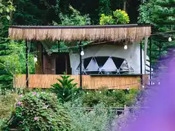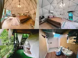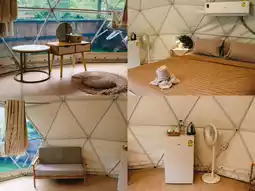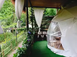 🏕️The accommodation is a large dome tent that is raised high, allowing a view of the vegetable and flower gardens. The interior is air-conditioned and has complete facilities, with a private bathroom. There is a balcony for sitting or working amidst nature.