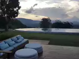 But the area I want you to see is the new swimming pool area of Sala Khao Yai. It's an infinity pool, meaning there's nothing to block this area. You have to come here because it's really beautiful. The real thing is much more beautiful than in the picture. You can see the sunset clearly like Vanilla Sky.