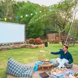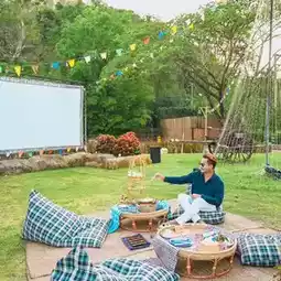 and watching an outdoor movie on the green lawn surrounded by nature.