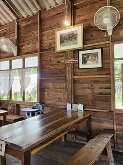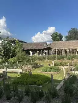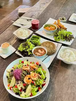 An organic salad restaurant with a great atmosphere in Khao Yai, where it feels like dining in a vegetable garden. They offer a variety of salad greens, cold-pressed vegetable and fruit juices, and delicious salad dressings. Additionally, there are other healthy menu options as well as general dishes like sour curry with cha-om, fried shrimp, single-plate meals, spaghetti, and mashed potatoes. The restaurant provides a wide selection of dishes and features photo spots with vegetable arches and tomatoes 🍅, giving off a natural farmhouse vibe that's refreshing.