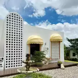 Today, I would like to introduce Suan Hunsaa Khaoyai, a cafe and restaurant located on the main road of Mittraphap Road. It is very beautiful and eye-catching. The decoration gives a very natural feel and you can also see the beautiful mountain view. The shop also has various corners for taking pictures and checking in. When you walk inside, you will see a house for dogs, chickens, and sheep. They are all so cute. There are many menus to choose from. Today, I tried the grilled pork chop steak. It was just right, soft and not dry. I ate it with lemon tea. It was sour and refreshing.