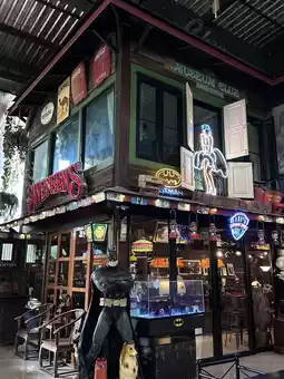 Highlights - A vintage wooden atmosphere contrasts with the emerald green river. The shop is decorated with tons of toys and collectibles. 🛵🛺🎠🎡