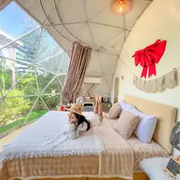 The dome-style glamping rooms are beautifully decorated, with private space, a balcony, and a small garden for a truly private atmosphere. There are two jacuzzis, both indoor and outdoor, and a hammock for relaxing and stargazing at night. 💫