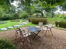 This cafe is nestled amidst nature, surrounded by trees and a small stream, creating a feeling of being surrounded by nature.