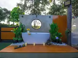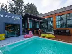 Pool villas with a foreign vibe at Hug Khao, Khao Yai. Invite your family or group of friends to relax here, as it is fully equipped with a large private saltwater swimming pool, a fully equipped kitchen, spacious balconies, a rooftop with mountain views, spa facilities, colorful lighting, a slide, and karaoke. There's also a garden area for taking photos or having a picnic. This place provides everything you need in one location.