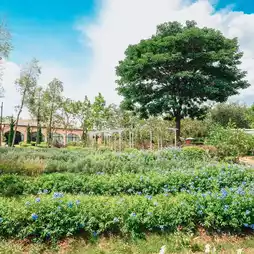 surrounded by a garden, trees, and a variety of flowers