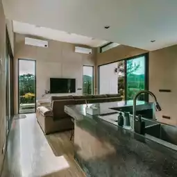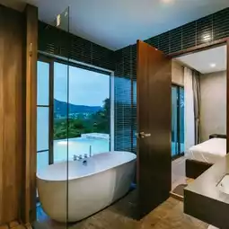 This villa can accommodate 4 guests. It has 2 bedrooms, 1 living room, a balcony with a large private pool, and a garden area for picnics or relaxing walks. The master bedroom is a good size with a comfortable bed. There's a work area behind the bed, and the end of the bed faces the pool, offering a stunning view from the foot of the bed. The other bedroom is located at the back, but doesn't have a view, but all rooms have en-suite bathrooms. The living room area features a sofa bed and a large Smart TV. However, there's no karaoke. The kitchen is located in the living room, fully equipped with cooking utensils, a refrigerator with an automatic ice maker, and a fully stocked minibar.