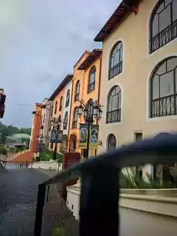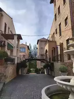 Khao Yai at Tuscany Valley has an atmosphere like being in another country. The weather was overcast and not hot, and the mountain views and architecture are beautiful. There's a wide selection of delicious Thai and Western food. It's a great place for couples or families. There's a restaurant, a beautiful photo spot, delicious ice cream, and a golf driving range. I loved the chill vibe.