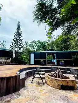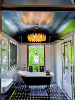 There's more than just a pool villa here; there's also an A-frame cottage and an Easter Egg house, repurposed from an old train car. The interior is decorated with vintage wood, and there's an outdoor tub, a garden jacuzzi, and a barbecue area with a campfire. It's perfect for chilling out and catching up with friends in the evenings. The atmosphere is amazing!