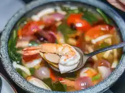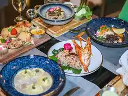 Audrey, the main restaurant here, is an all-day dining venue, starting with a breakfast buffet (if you go on Friday-Sunday, it's a full buffet breakfast, but on other days, it's a mini buffet). I ate here every meal: breakfast, lunch, and dinner. I got to try a wide variety of dishes, from Thai to international, all perfectly balanced. The pomelo salad was served with large grilled river prawns. The tom yum goong (shrimp soup), the grilled chicken curry, and the beef fat fried rice were incredibly flavorful. The truffle cream ravioli was rich and creamy, with a truffle aroma. The salmon pasta was a Japanese carbonara-style dish, with seaweed, salmon roe, and shrimp roe. Finally, the afternoon tea set included a full range of sweet and savory canapes.