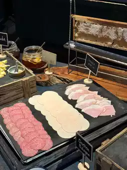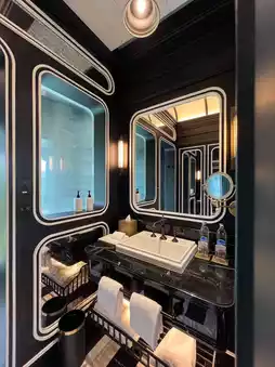 All rooms are themed, creating a luxurious train-like atmosphere. The rooms are clearly divided into distinct sections, yet feel comfortable. High ceilings and spacious balconies offer breathtaking views of the lake and mountains. I highly recommend the dark brown-themed room, which is absolutely stunning, reminiscent of a train carriage. The bathroom offers a stunning view.