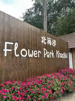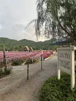 This picturesque spot features a vast flower field set against a backdrop of distant mountain ranges, making it a perfect location for stunning photos 📸. The park is equipped with well-maintained walking paths, allowing visitors to enjoy the vibrant gradient of colorful flower bands up close. Even the entrance sign and wooden fences around the park are great photo opportunities. The on-site shop offers drinks, light snacks, and clean restrooms, making it a convenient place for a short break 🥤🌿.