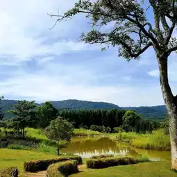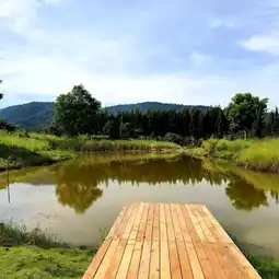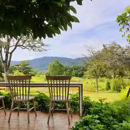 The outdoor area ๐ is a green garden. There's a pond and a mountain view in front of it, it feels like a painting, giving you an amazing feeling. โ๏ธ๐ฐ