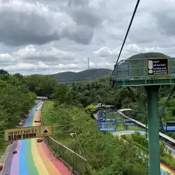 • According to the picture, we chose to play one of the rides, the Flying Fox or the Sky Pulley. We hang on a cable and slide down the path. On the way back, we took the cable car back. 🎡